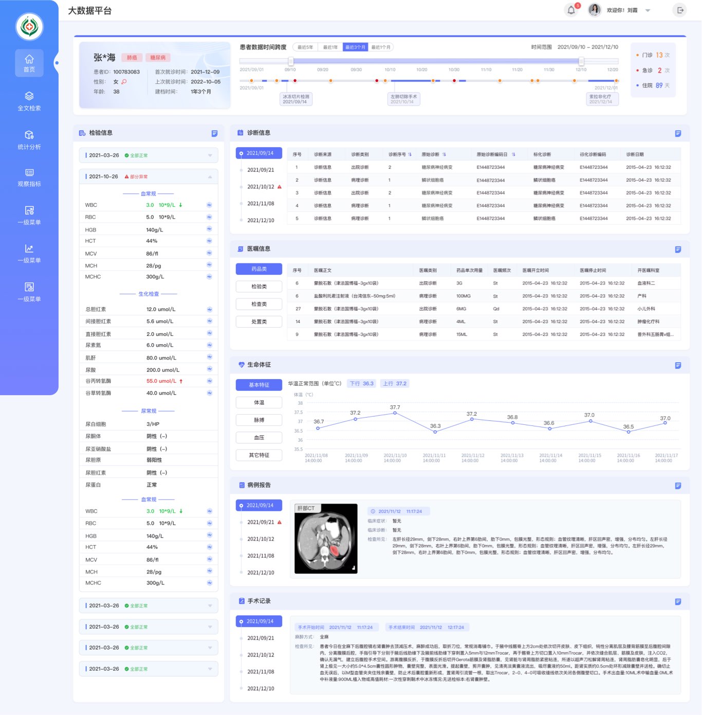 核心數(shù)據(jù)突出顯示-原來首頁沒有登錄人員信息,并且 [患者人數(shù)]、T病例份數(shù)]、手術(shù)臺數(shù),等數(shù)據(jù)每個占據(jù)一個大框顯示頁面顯得空洞,通過整合增加登錄人員信息以及歡迎語,使整個頁面更有親和力,一些相關(guān)數(shù)據(jù)采用卡片疊加的形式展示,不能可以增加整個頁面的靈動感,并且把登錄人員的相關(guān)信息緊密關(guān)聯(lián)起來