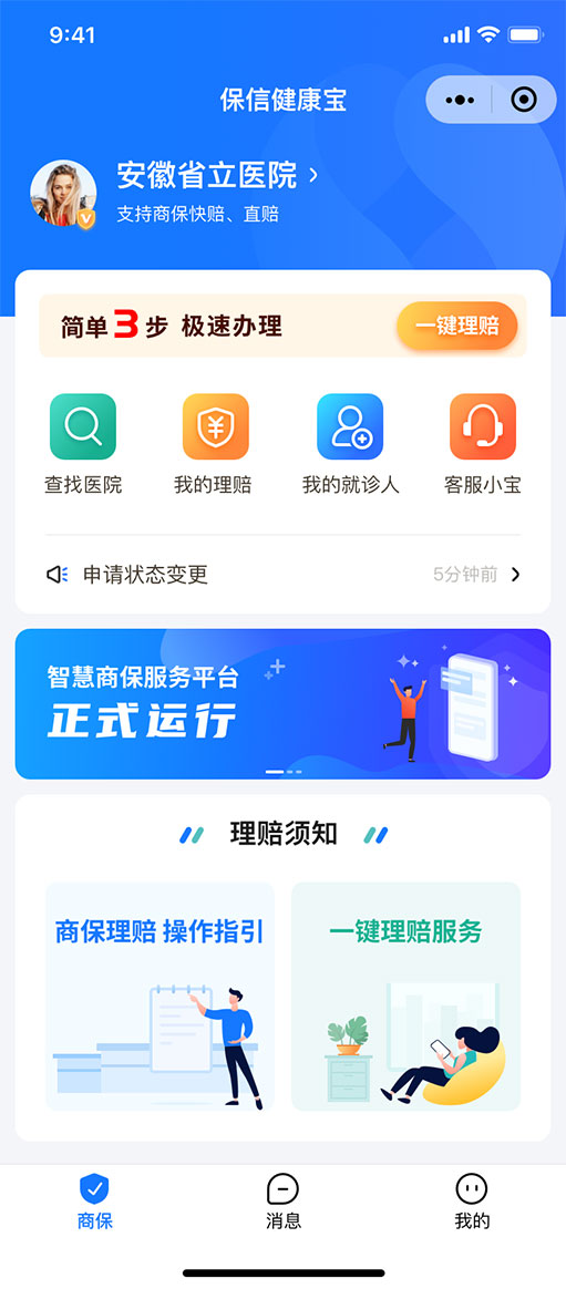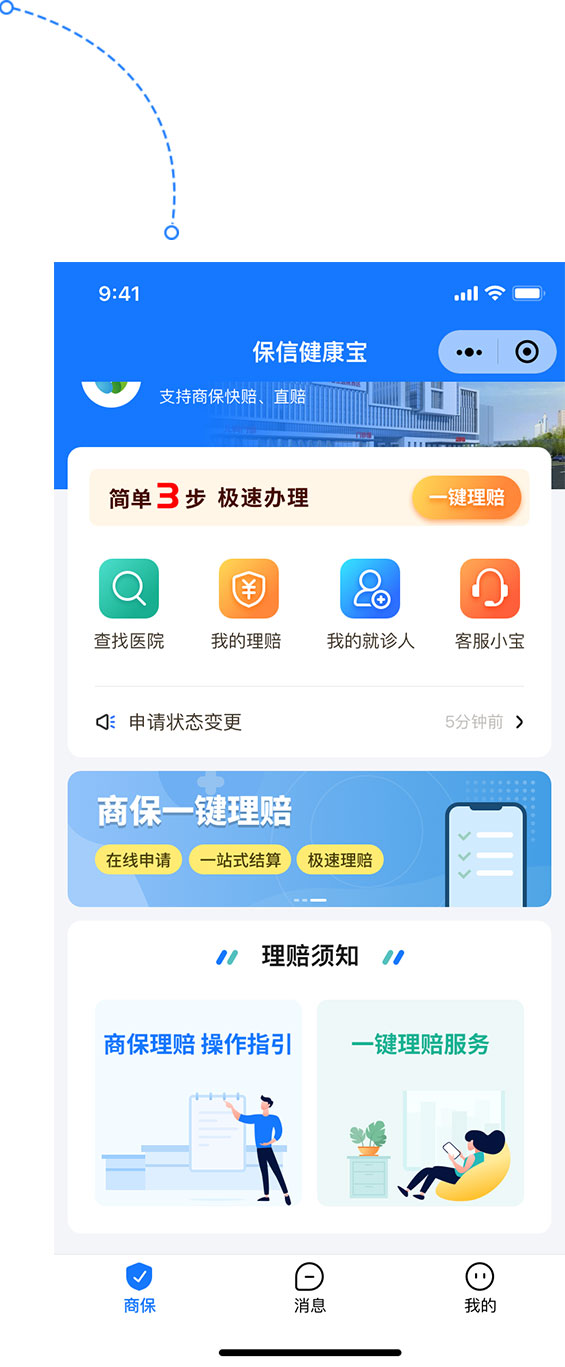 保信健康寶小程序是智慧商保報(bào)案統(tǒng)一服務(wù)平臺(tái),讓就醫(yī)更方便,讓理賠更便捷,理賠安全精準(zhǔn),服務(wù)便民惠民。其產(chǎn)品優(yōu)勢(shì)是一鍵申請(qǐng),快速便捷、本人授權(quán),保護(hù)隱私、商保結(jié)算,安全放心、極速理賠,快速到賬。