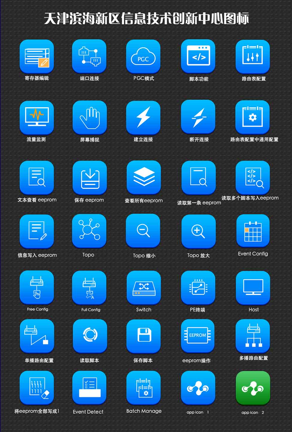 此次圖標設計是為蘇野芯片高速串行rapidio芯片配置軟件配套設計的圖標。圖標分為按鈕圖標和提示性圖標2部分。藍藍設計負責軟件啟動圖標設計和軟件內圖標設計。